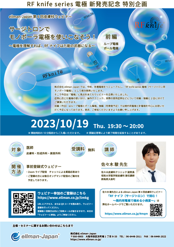 第6回皮膚科ウェビナー「サージトロンでモノポーラ電極を使いこなそう ~電極を理解すれば、RFナイフは万能の武器になる~ 前編」