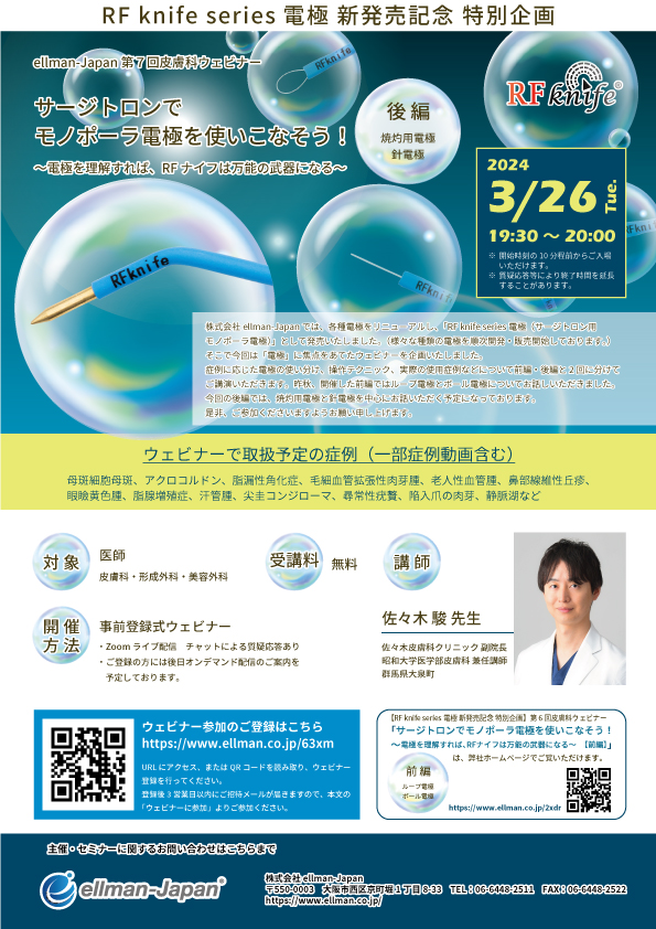 第6回皮膚科ウェビナー「サージトロンでモノポーラ電極を使いこなそう ~電極を理解すれば、RFナイフは万能の武器になる~ 前編」