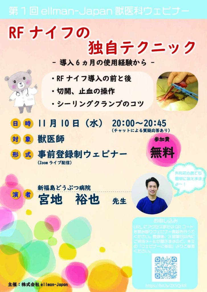 第1回獣医科ウェビナー「 RFナイフの独自テクニック - 導入6ヶ月の使用経験から – 」開催日時:2021年11月10日(水)20:00~20:45