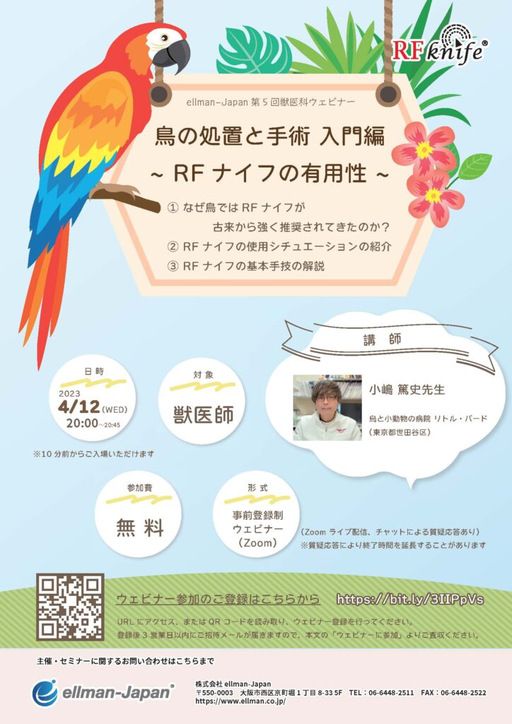 第5回獣医科ウェビナー「鳥の処置と手術 入門編 ~RFナイフの有用性~」開催日時:2023年8月29日(火)20:00~20:45